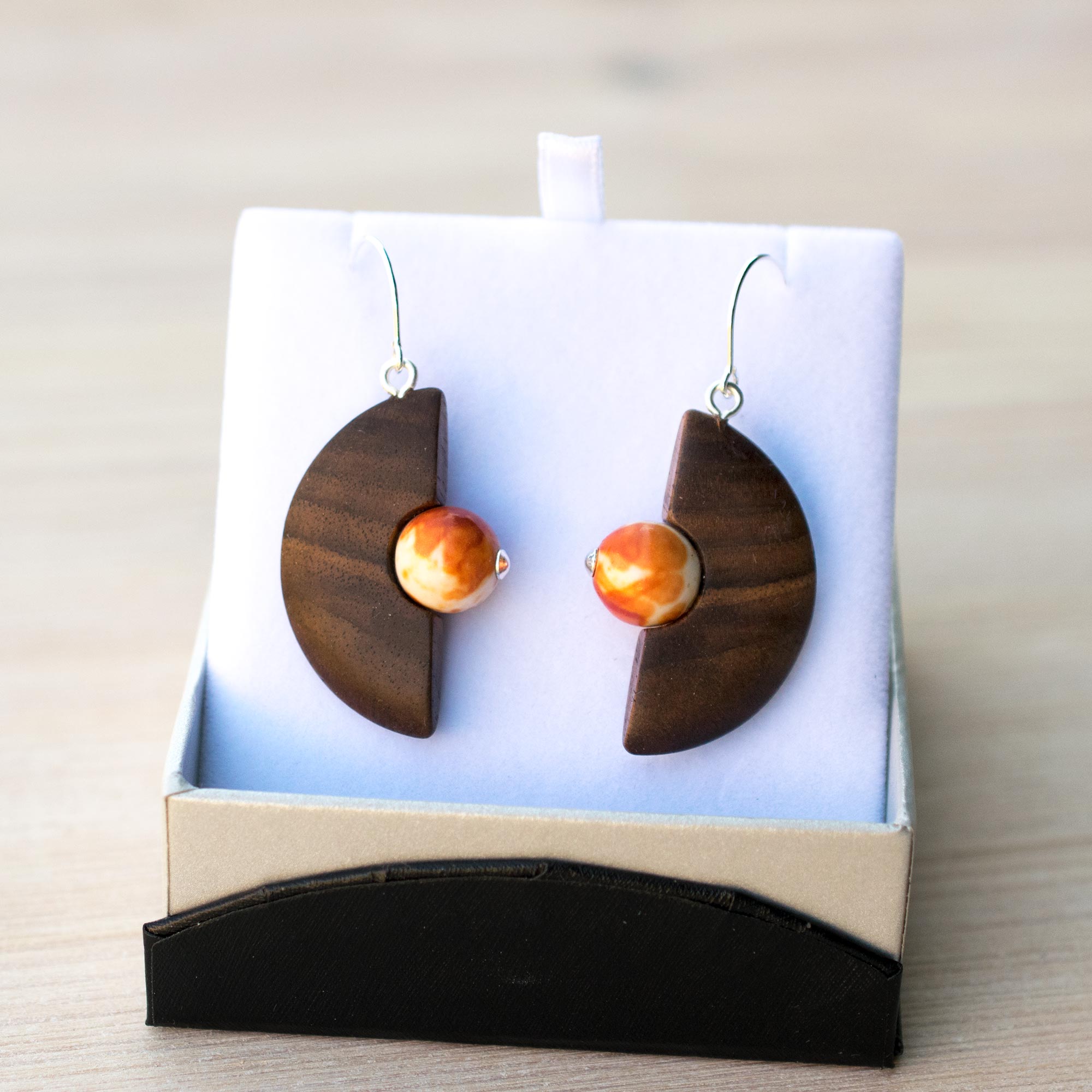 Walnut Wood / Orange rain flower jade / 925 Sterling Silver Hook Earrings